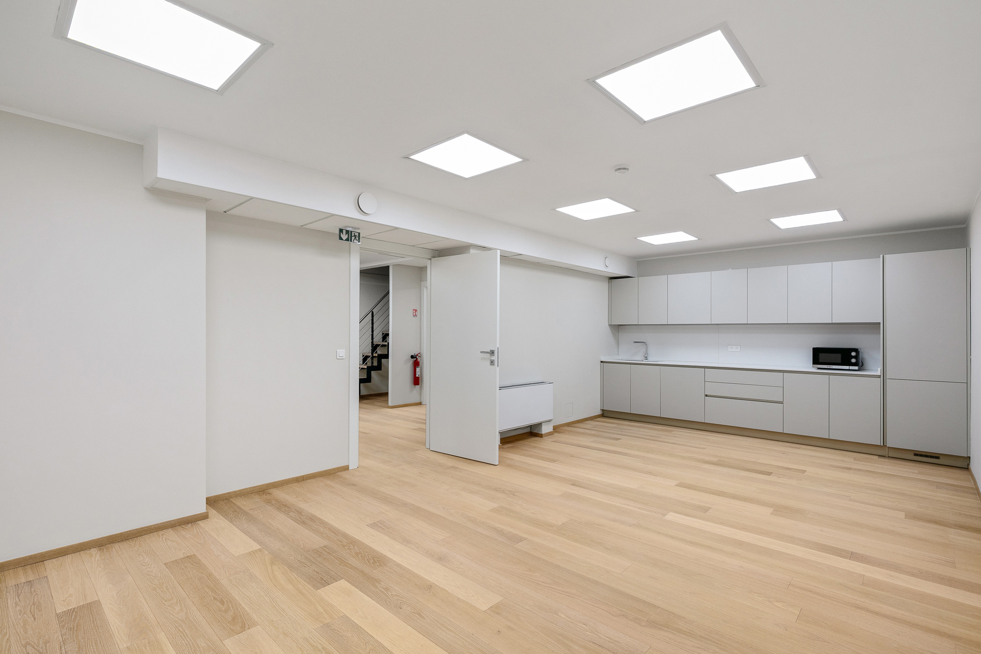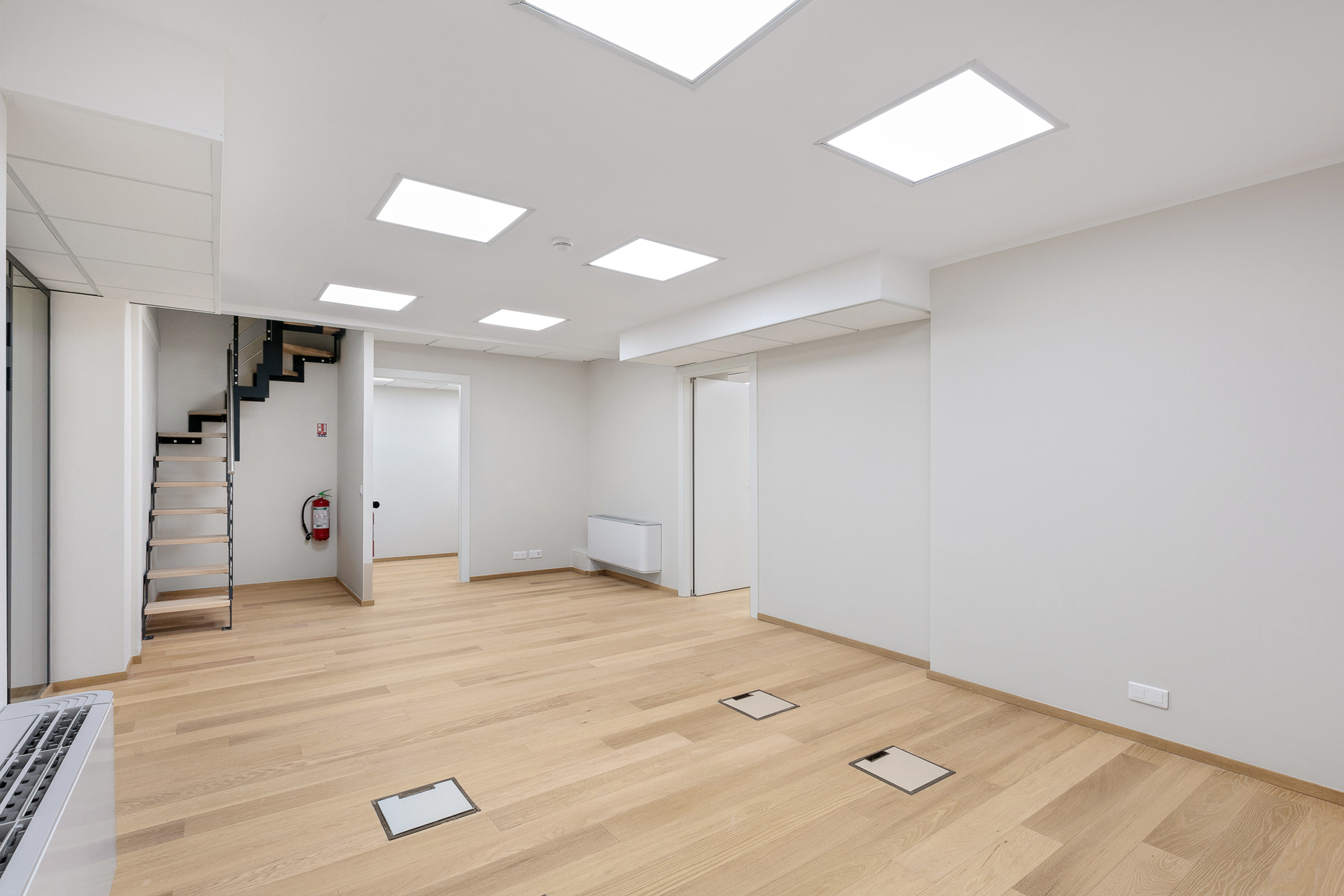 Si compone di un ingresso, di uffici indipendenti distribuiti su più aree, di un grande open space che offre grande flessibilità, di un magazzino, di una grande salla con cucina attrezzata e di servizi igienici per uomini e donne.