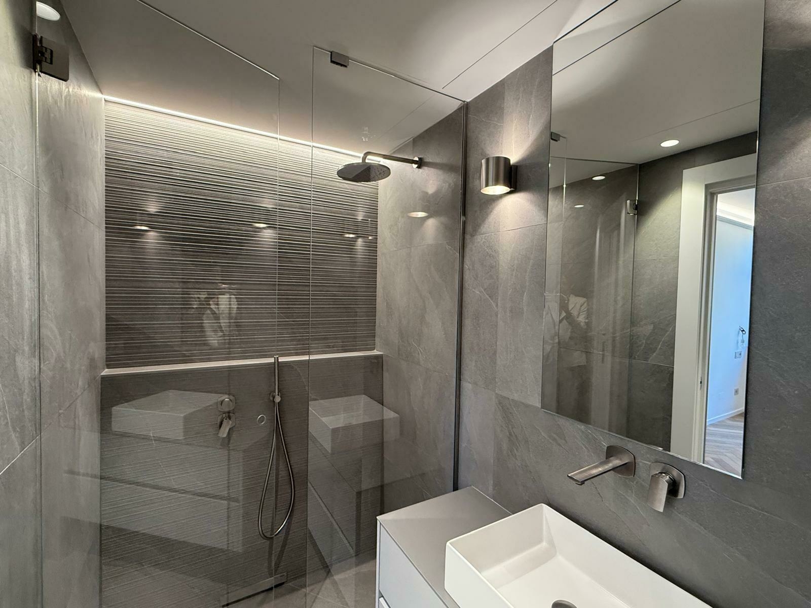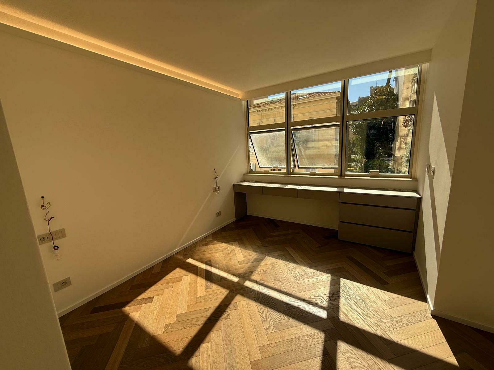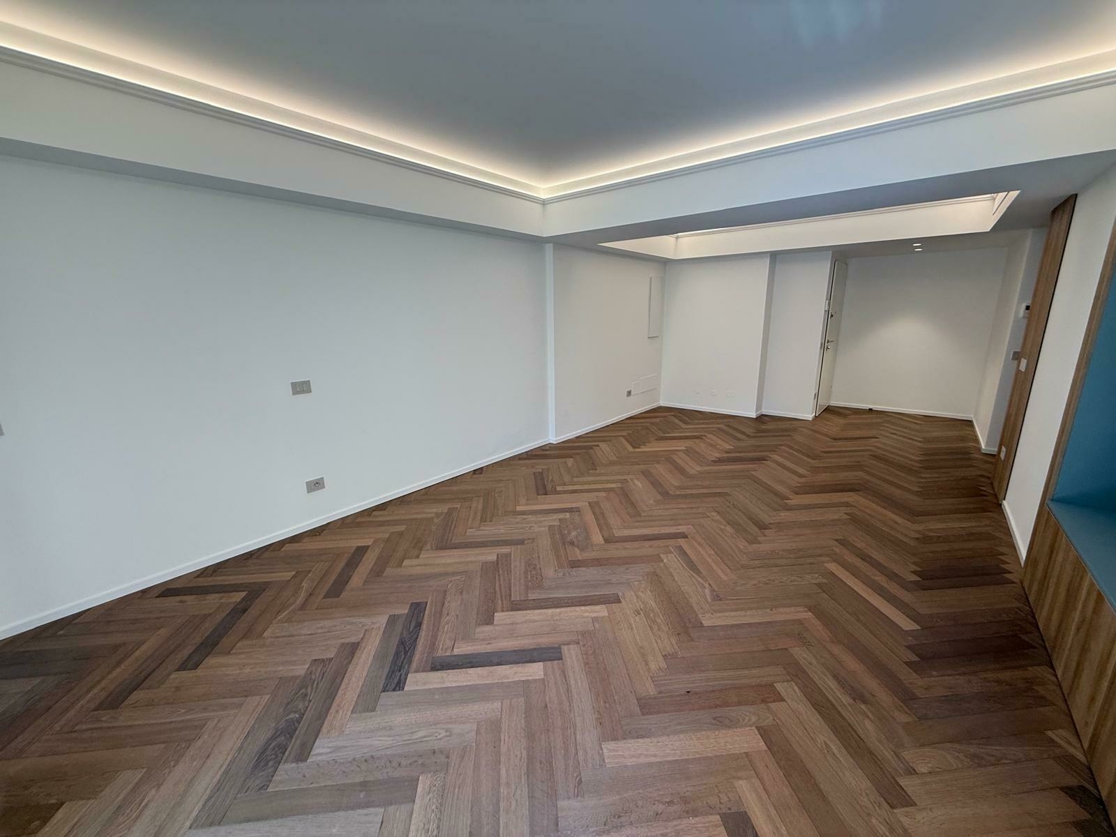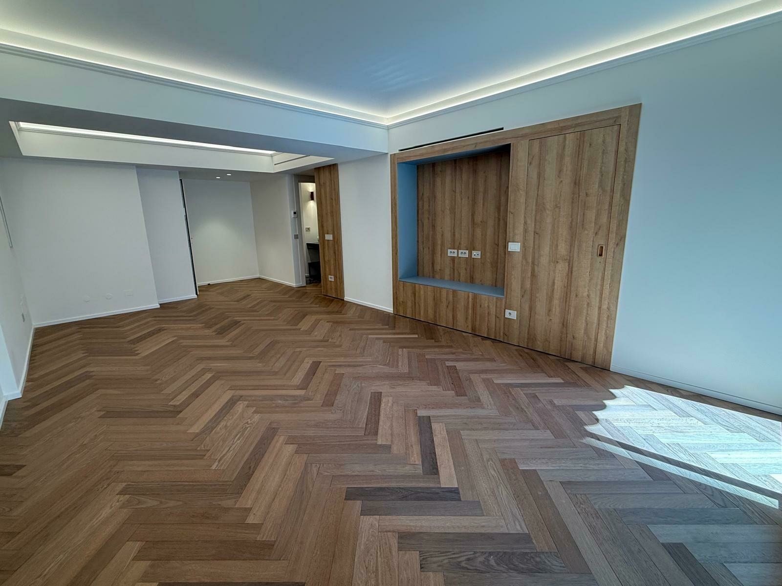 L'appartamento è composto da un ingresso, un ampio soggiorno/zona pranzo pranzo molto luminoso con parquet a spina di pesce ed illuminazione a LED incassata, con accesso diretto a una loggia.