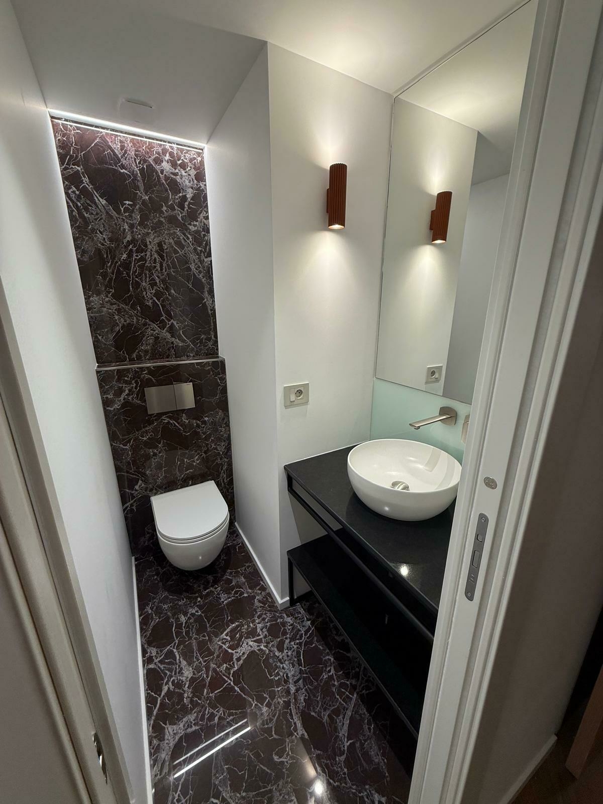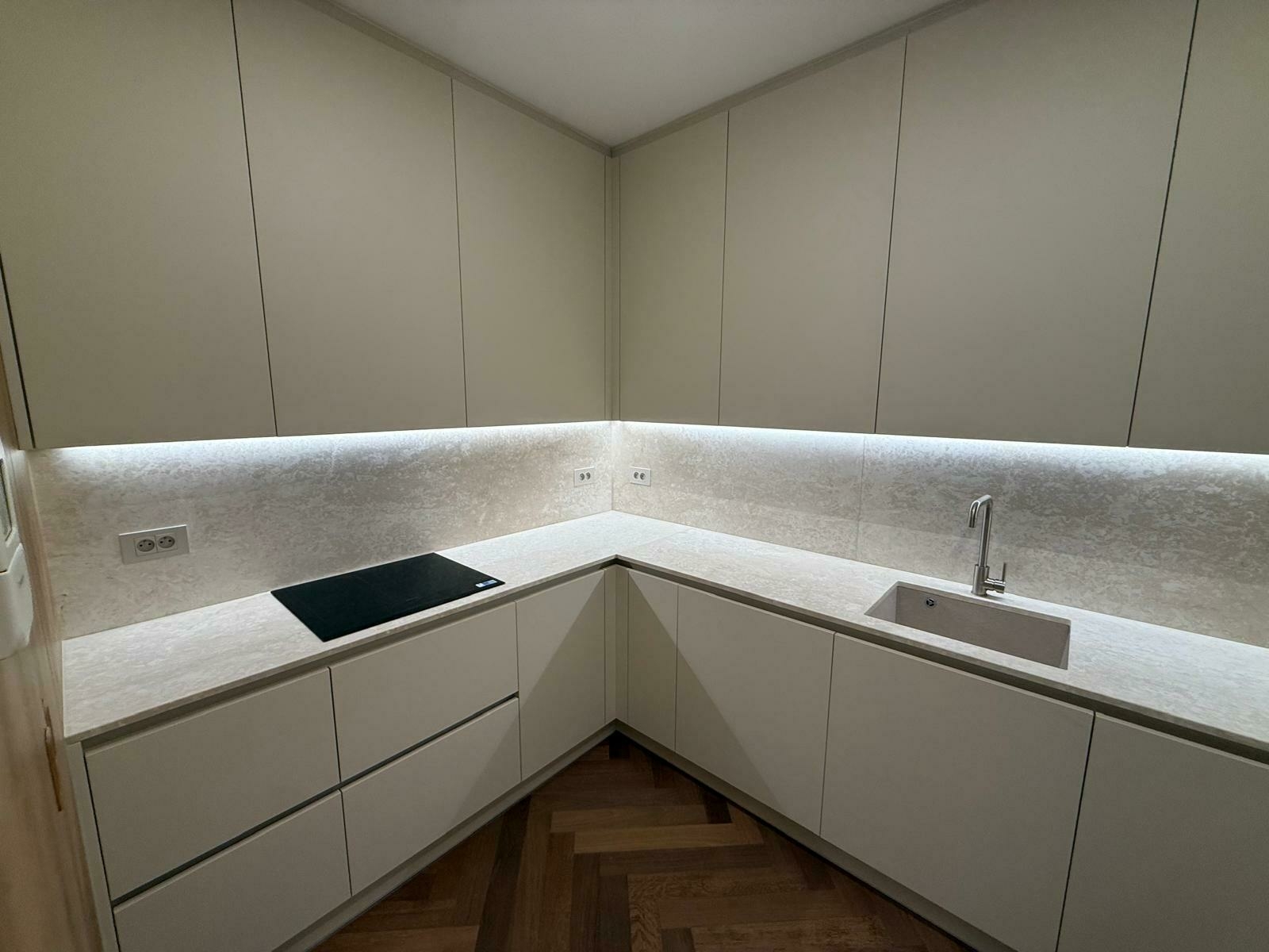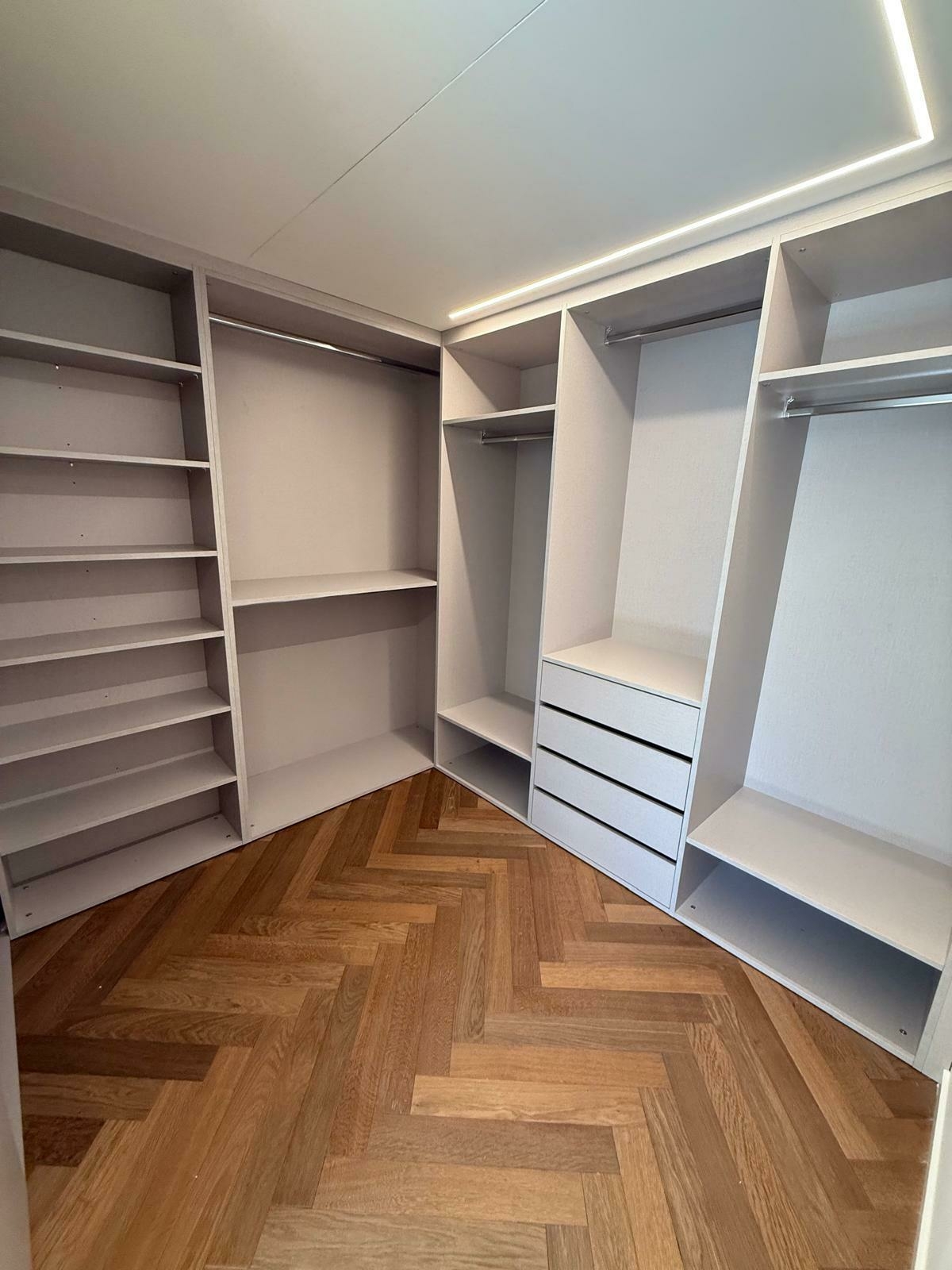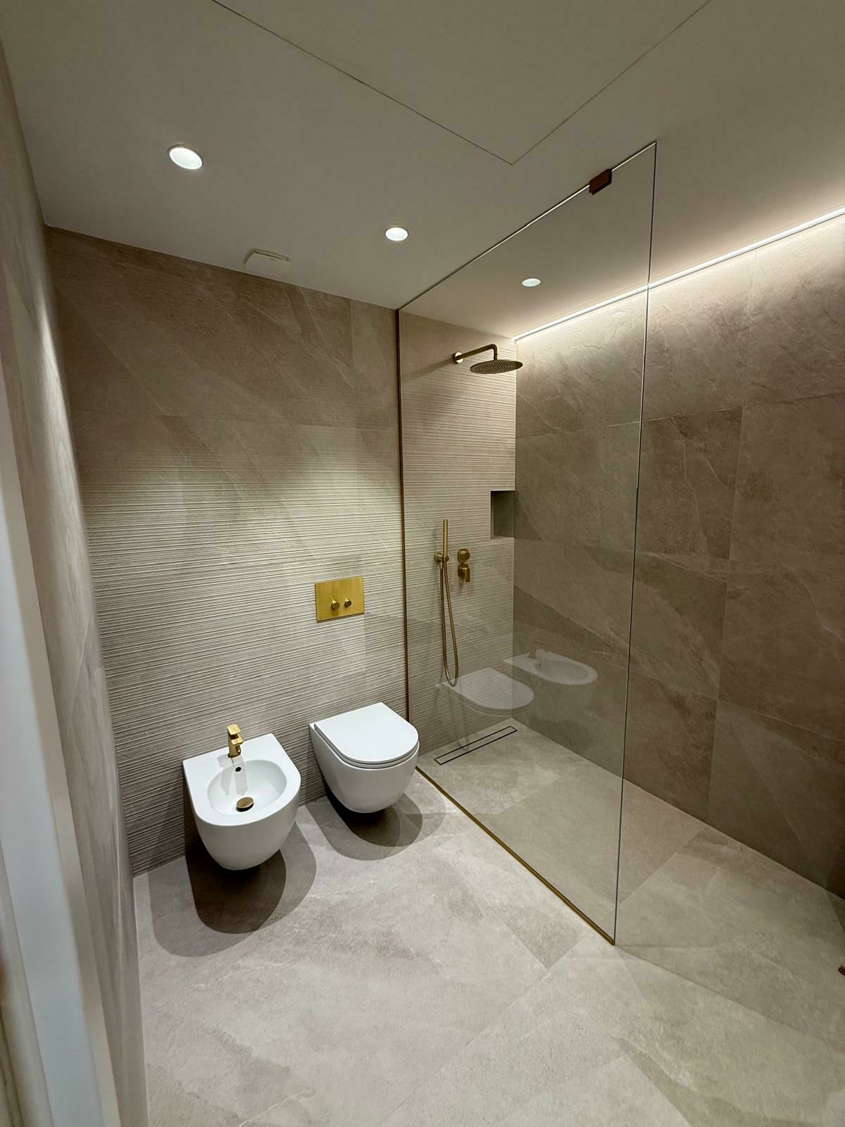 L'appartamento è composto da un ingresso, un ampio soggiorno/zona pranzo pranzo molto luminoso con parquet a spina di pesce ed illuminazione a LED incassata, con accesso diretto a una loggia.
