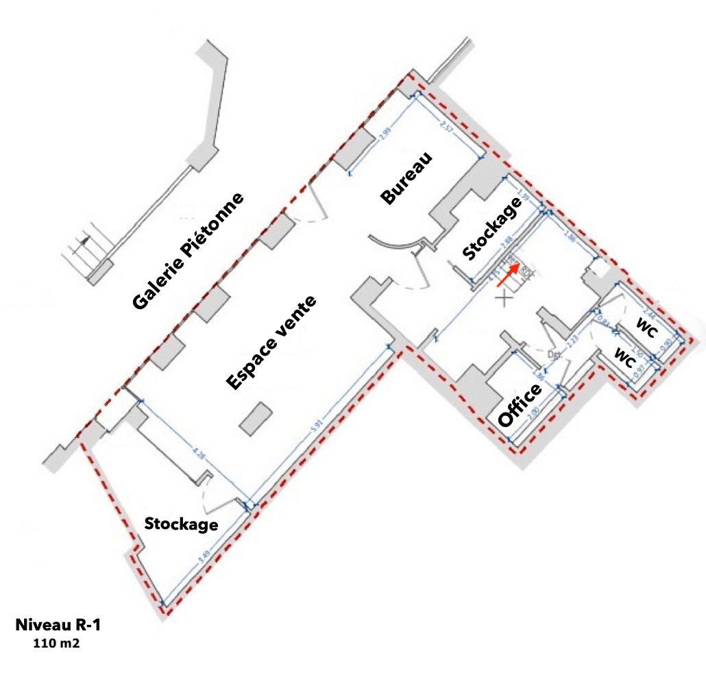 Surface totale : 180 m2 (Rez-de-chaussée : espace de vente : 70 m2 environ) + (Niveau inférieur : bureau, espace de vente, espace de stockage, coin cuisine, sanitaires homme/femmes : 110 m2 environ)