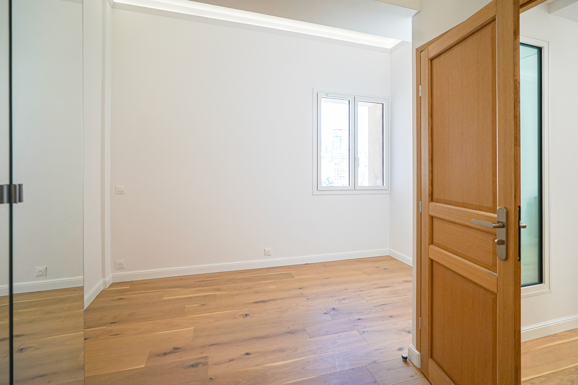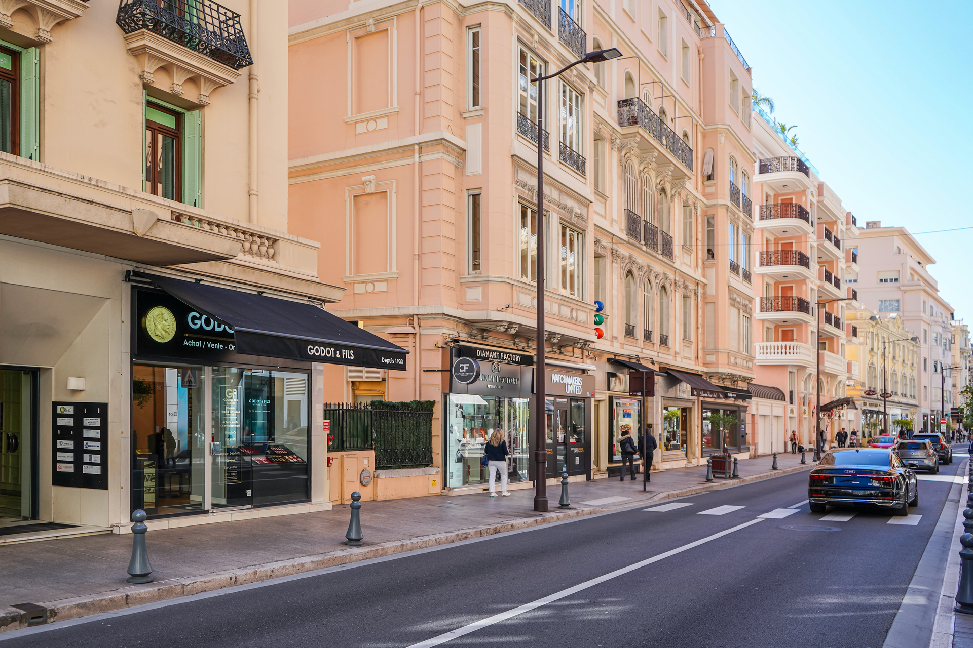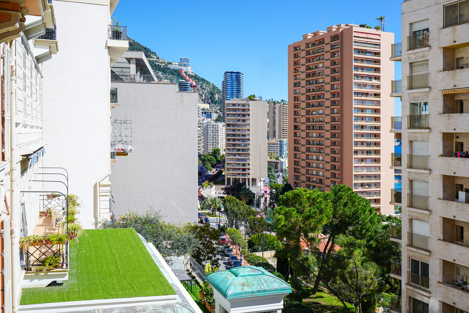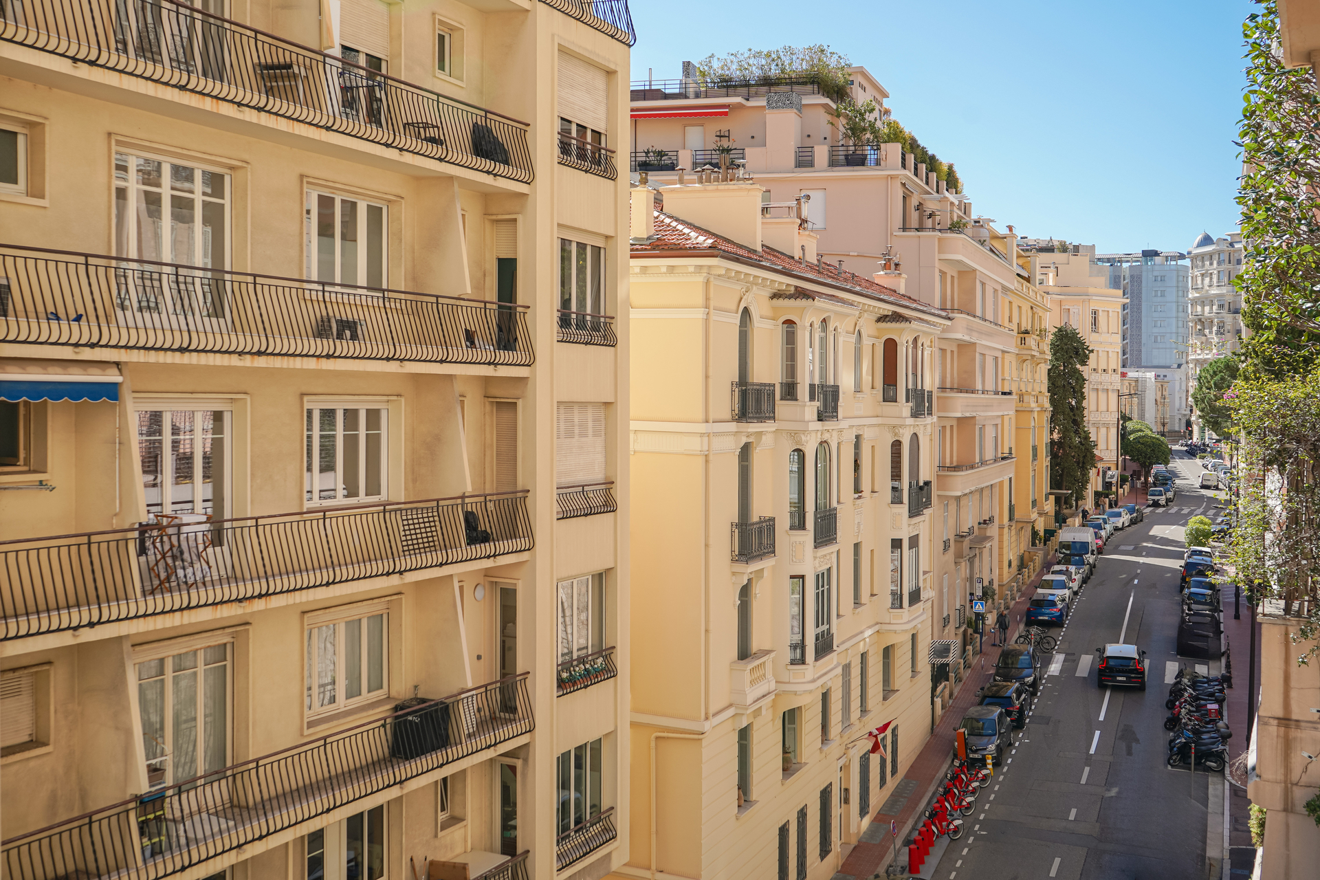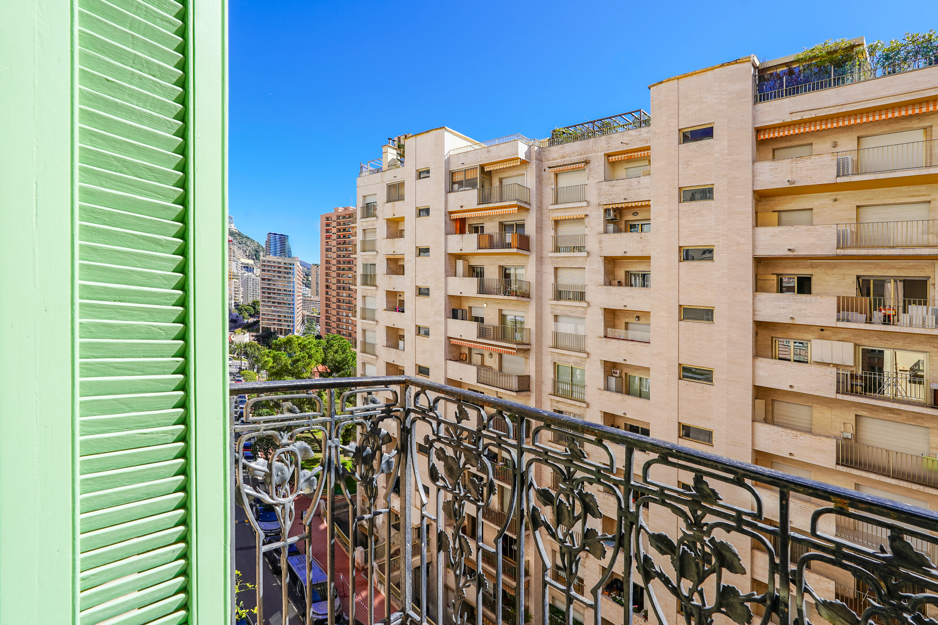 Affacciato su Avenue de Grande Bretagne, l’appartamento gode di un ambiente tranquillo nel pieno centro di Monaco.