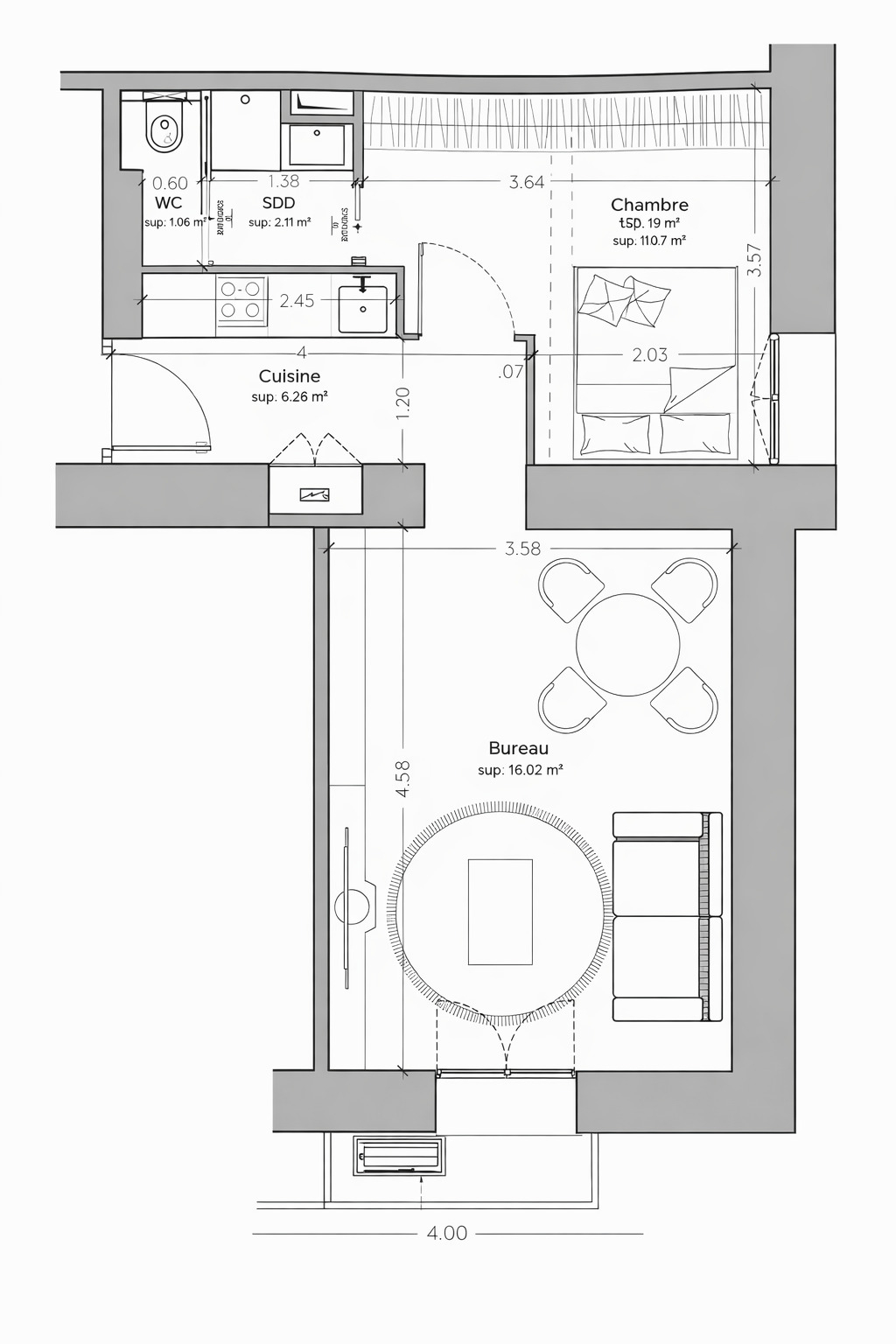 Questo bilocale d’angolo è composto da un ingresso con cucina a vista completamente attrezzata, un luminoso soggiorno con accesso a un balcone esposto a Est, e una camera da letto con bagno con doccia e W.C. Numerosi armadi a muro completano la proprietà. La doppia esposizione garantisce un’ottima luminosità durante tutta la giornata.